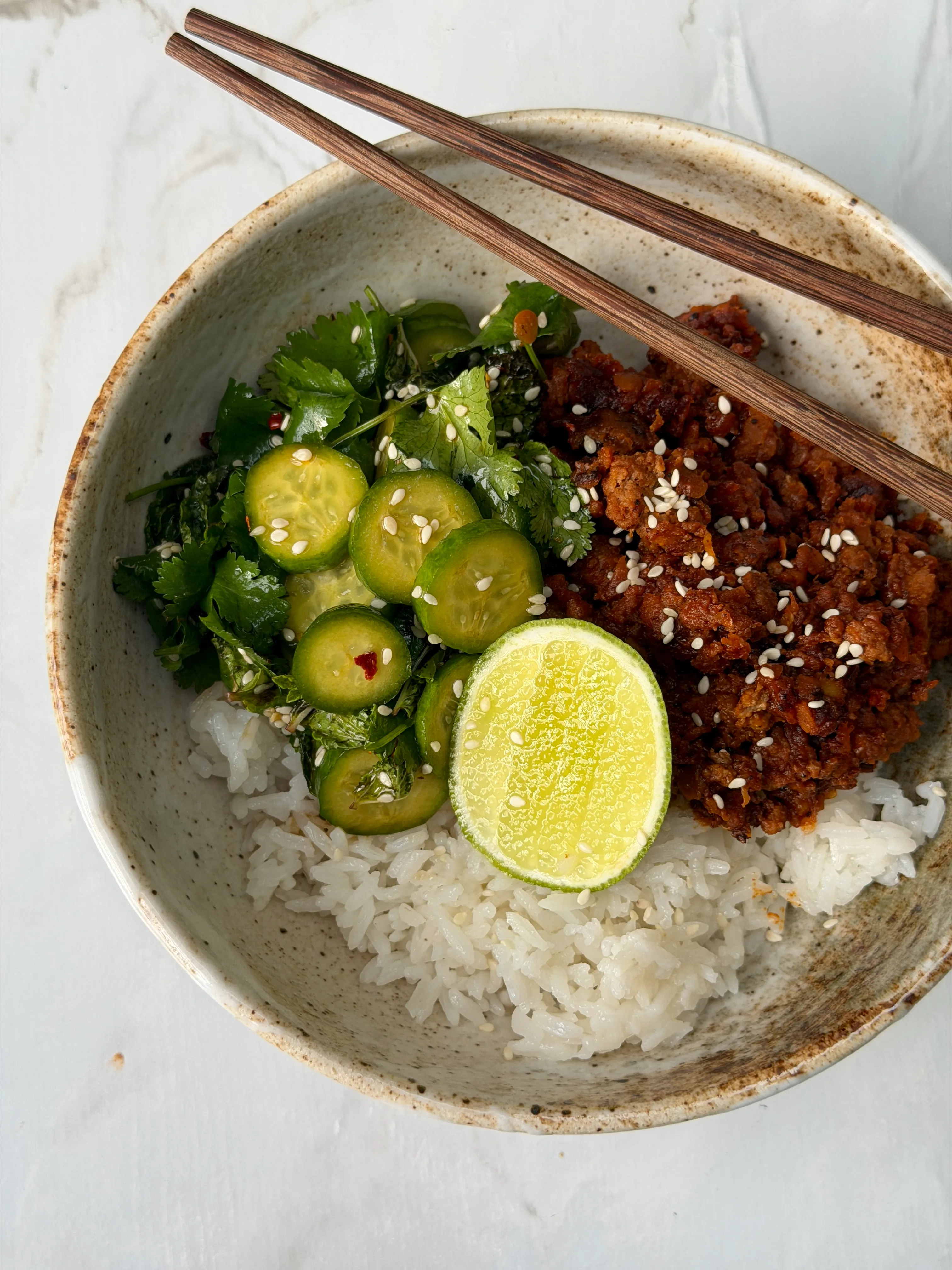Dinner number three leans Korean-inspired. The ragu is warmed with ginger, sesame oil and gochujang until glossy and slightly sticky, then spooned over soft jasmine rice. On the side: a bright, herby cucumber salad that cuts through the richness.